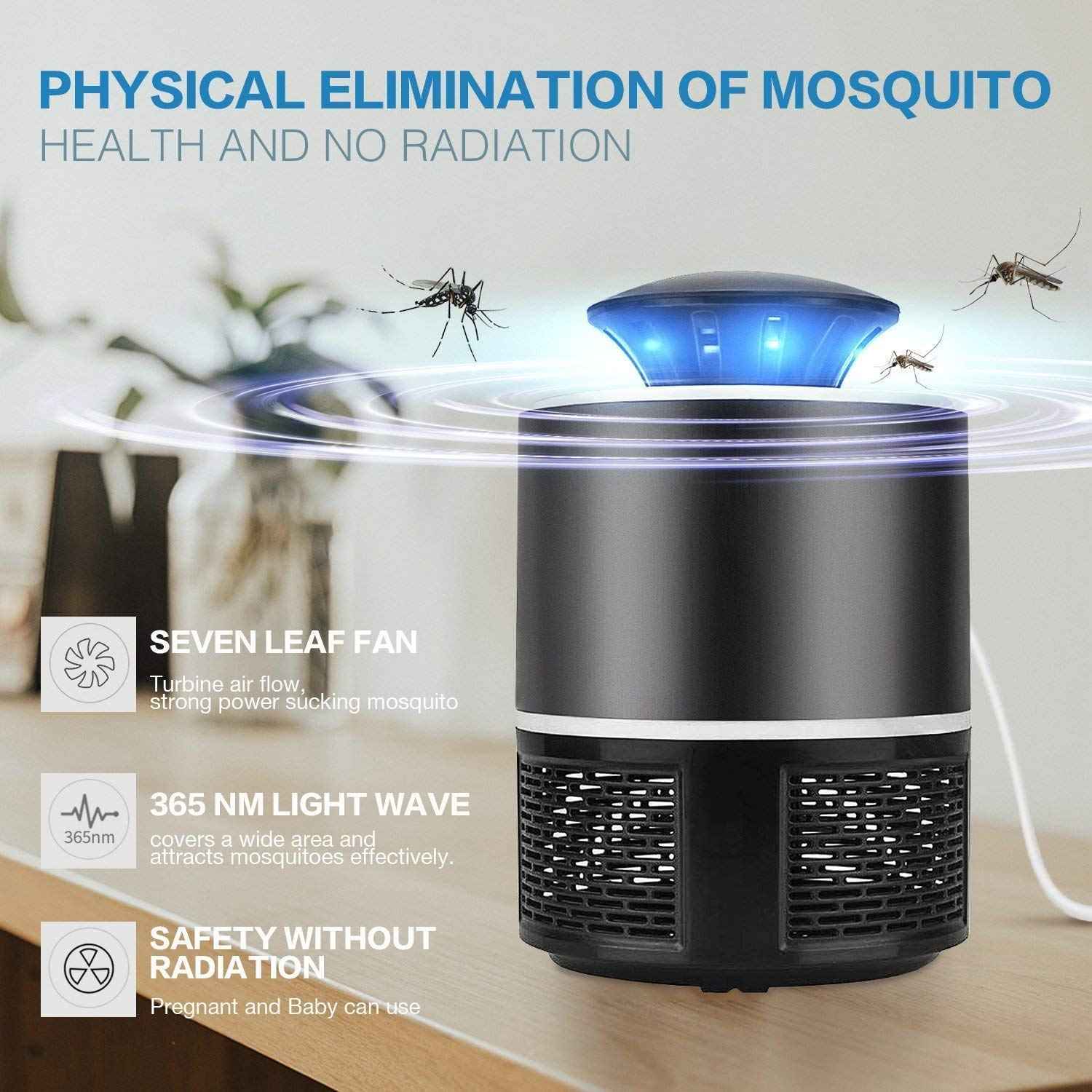 The mosquito trap killer in the bedroom must be opened in advance(at least 3 hours). Do not turn it on until bedtime. Do not open the bottom tray immediately in the morning because the mosquitoes trapped inside the tray may fly out. Keep it running for 2 more hours so that the mosquitoes suffocate to death. For the trap to work efficiently it should be placed far away from the fan and the room should be kept as dark as possible. The effect is better in uninhabited environment, because people’s body temperature and smell are more attractive to mosquitoes. This product uses the physical way to kill mosquitoes, it can’t kill a mosquito when just turning it on.