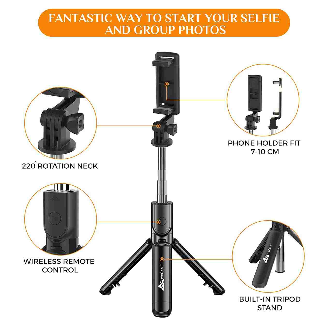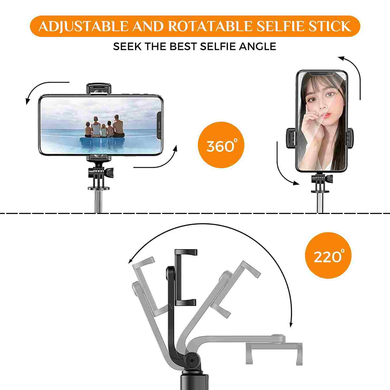 - Selfie Stand for Mobile Phone can be Rotated to 360 degree + 220 Degree Angular Adjustment